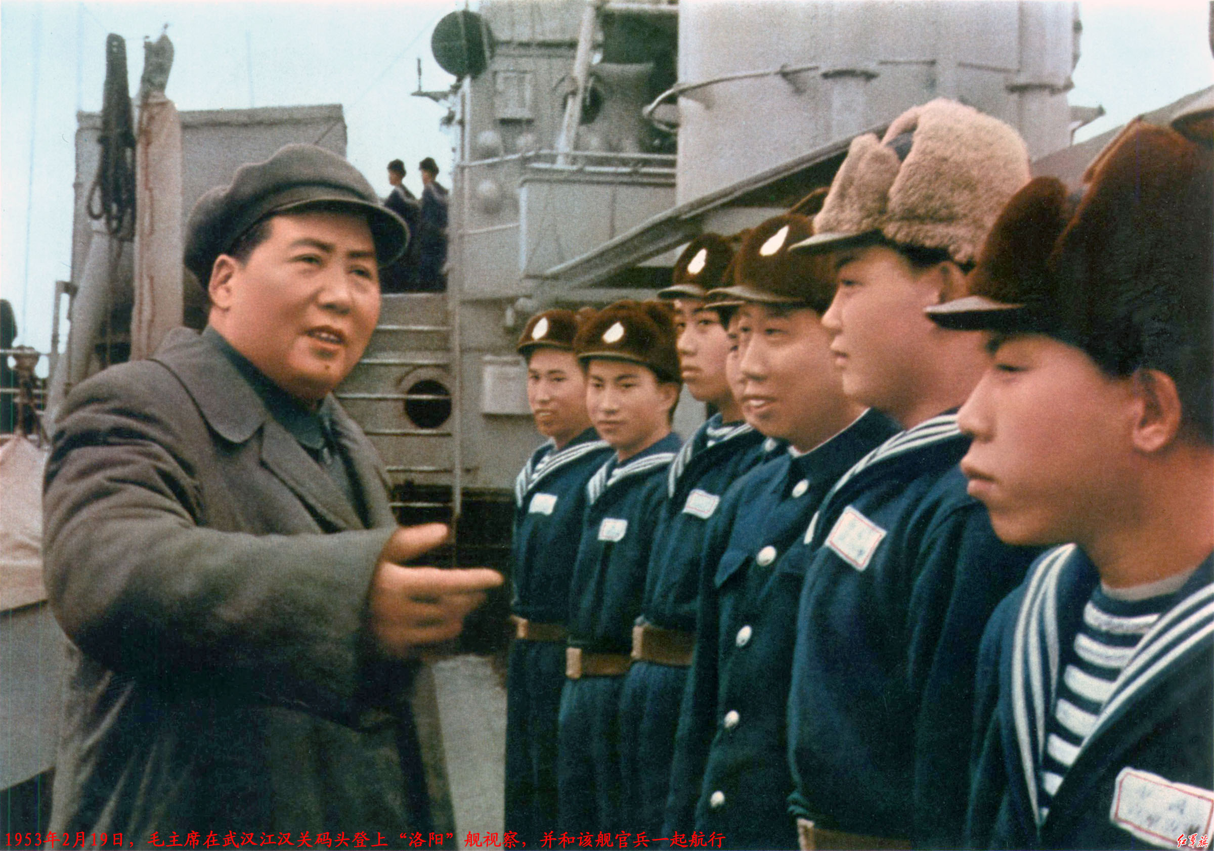 在舰上,毛主席看望了战士们以后,便到了后主炮“130”大炮的前面看操演。冯尚贤开始指挥来这里接受检阅的舰艇,毛主席看了很满意。之后,一行人就到了会议室。